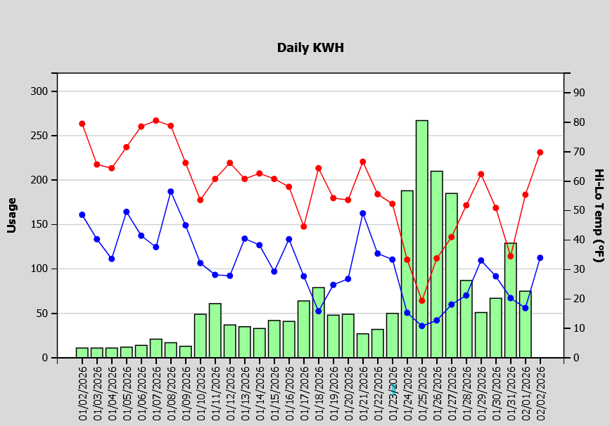 It’s easy to forget how dramatically a cold snap can affect your bill when most of the winter weather has been mild. North Texas experienced a sudden Arctic front in January.This graph shows how cold temperatures significantly increased energy usage. The red and blue lines are the day’s high and low temperatures. As a frigid blast of Arctic air and freezing rain/sleet settled in on Jan. 24, this member’s DAILY usage (as seen in the green usage bars) skyrocketed.